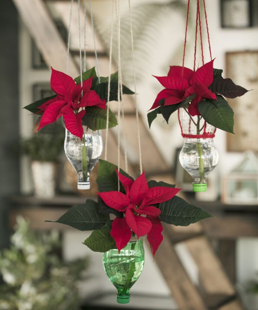 Привлекателна украса за прозореца: украсена с празнични аксесоари като коледни украшения, формички за бисквитки и хартиени звезди, една интересно оформена клонка може да се превърне в оригинална украса за прозореца за нула време. За да направите тези живи мини коледни звезди за окачване, внимателно извадете мини коледните звезди от саксиите, покрийте корените с мъх и ги увийте с прежда. Това е всичко! Можете да поливате растенията леко отгоре с капка вода. Като алтернатива, поставяйте увитите корени в съд с малко вода на всеки няколко дни, за да може мъхът да я попие. Оставете да се отцеди добре.