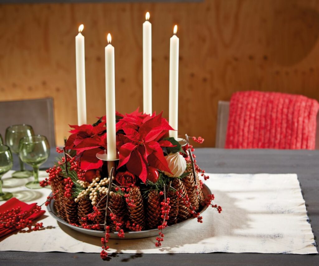 Nur eine Variante von unzähligen Möglichkeiten: Gruppiere mehrere Mini-Weihnachtssterne in Übertöpfen auf dem Tisch. Dazu ein paar Kerzen, Kugeln und eine Vase mit einem Kiefernzweig. Das sorgt sofort für eine kommunikative Atmosphäre. Je nach Farbwahl ändert sich die Optik. Die Stimmung kann auch klassisch, elegant, rustikal oder fröhlich werden.