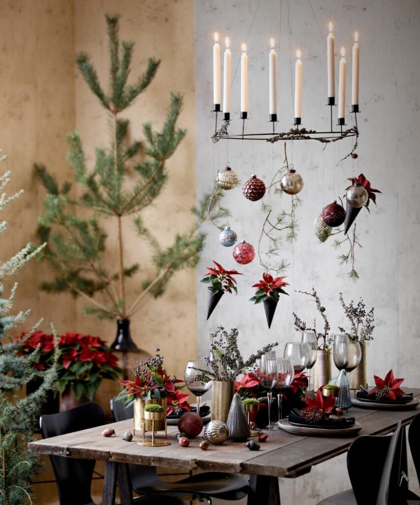 Imagen izquierda: Con ocho velas en lugar de las cuatro que se ponen normalmente, esta corona colgante de velas no es la típica corona de Adviento, sino una alternativa sorprendente para aquellos que les gusta menos tradicional. Decorado con adornos, ramitas y hojas en miniatura, este candelabro flotante es un precioso elemento decorativo festivo.