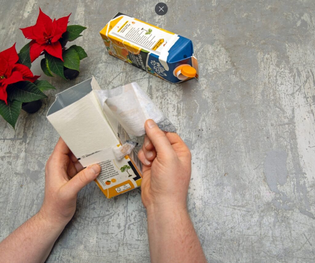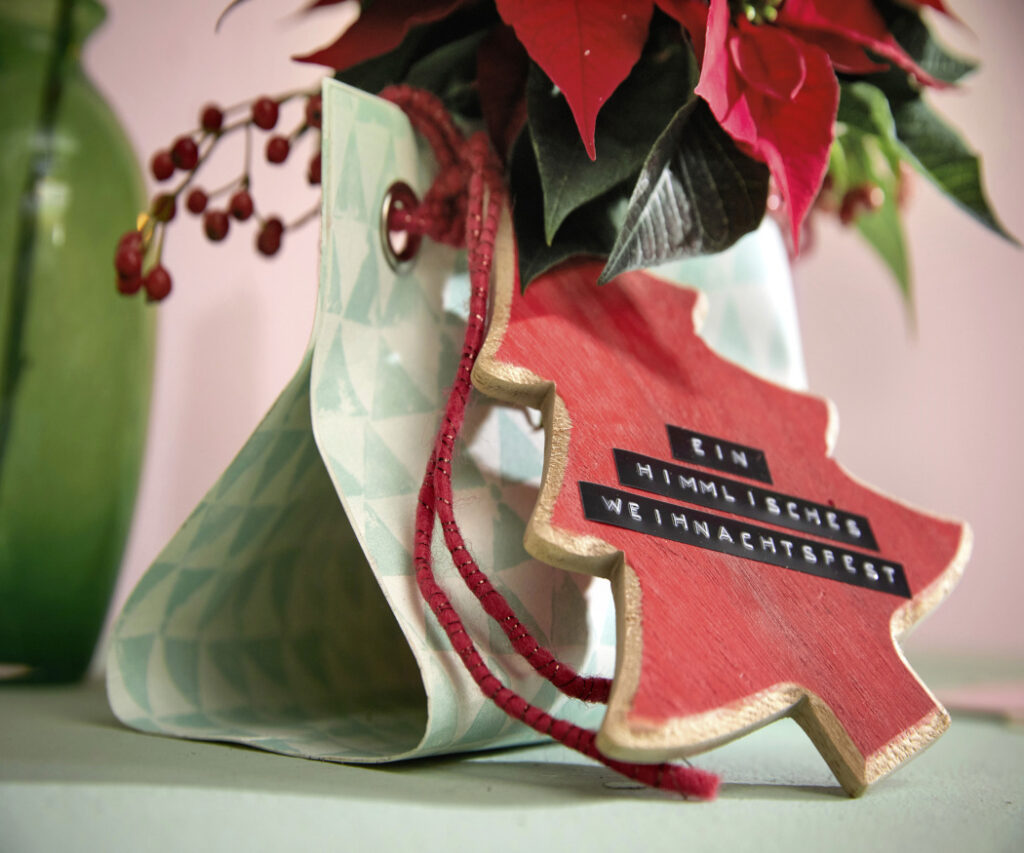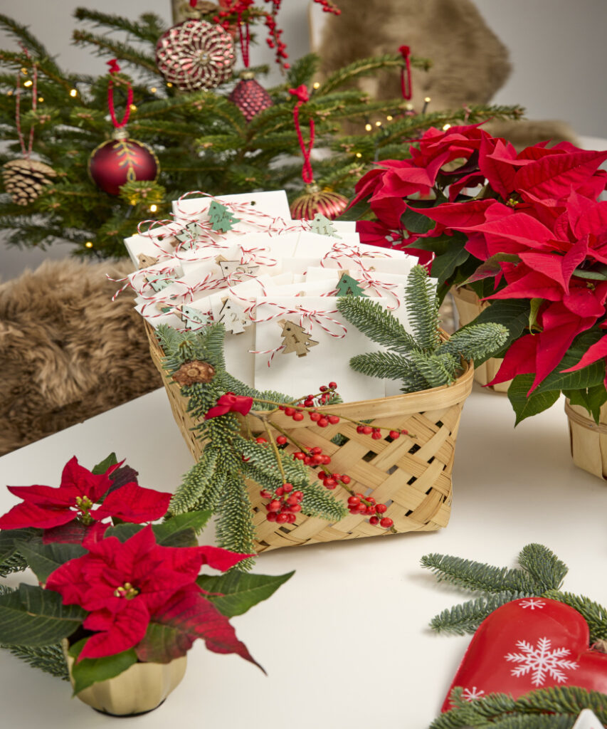 Entre las propuestas más sencillas destaca la transformación de la flor de Pascua en un regalo especial mediante envoltorios creativos. A partir de un trozo de papel pintado reciclado, es posible elaborar una bolsa artesanal que, acompañada de una etiqueta de madera y pequeñas ramas naturales, convierte una planta en un detalle personal y sostenible.