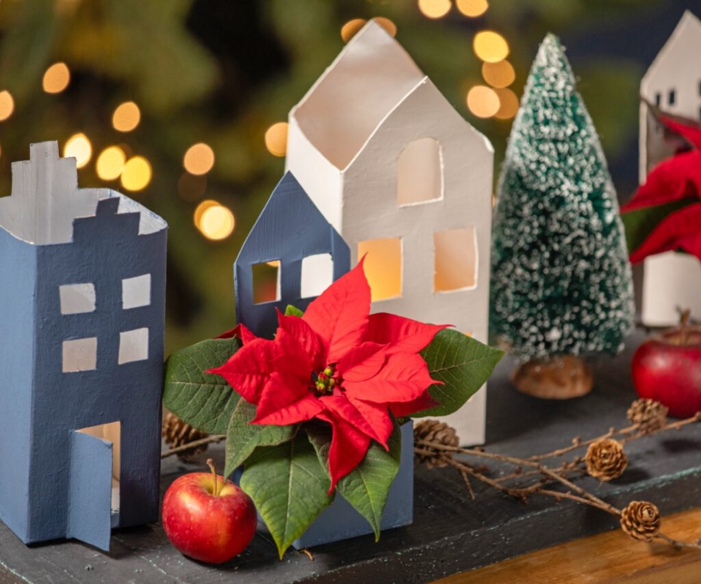 Desde envoltorios artesanales hasta pueblos navideños hechos con cartón, las poinsettias invitan a compartir tiempo de calidad en familia