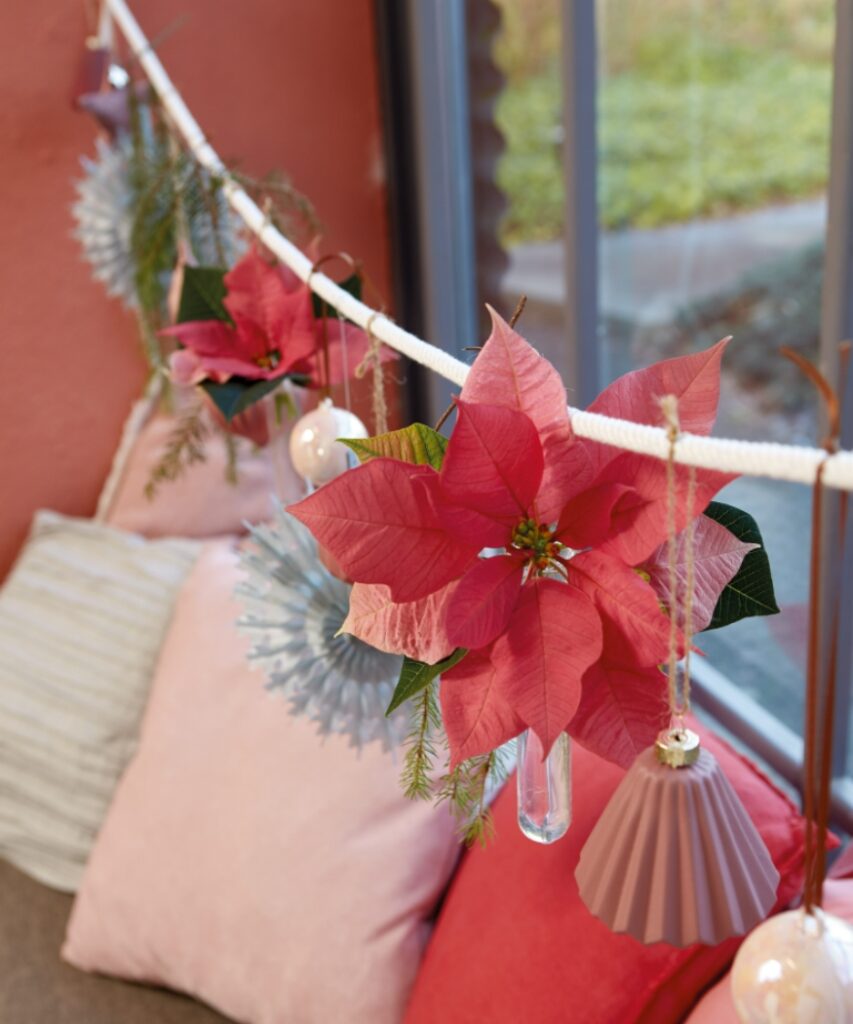 Avec le poinsettia, les inspirations ne manquent pas. Pour un style naturel, misez sur la présentation en kokedama : la motte de la plante est enveloppée de mousse et maintenue avec de la ficelle. À suspendre ou à poser sur un plateau accompagné de pommes de pin, de branchages et de bougies, c’est la garantie d’un coin de fête chaleureux. Comme autre option, vous pouvez associer plusieurs tailles et couleurs pour un effet ludique, ou alignez des mini-plantes sur la table pour une décoration élégante et conviviale.