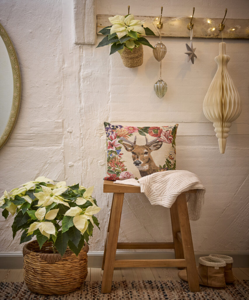 Απαλά γούνινα γάντια, γεμισμένα με κόκκινα και λευκά πιτσιλωτά μίνι αλεξανδρινά, κλαδιά από έλατο και κουκουνάρια, προσθέτουν μια εκλεπτυσμένη χειμερινή πινελιά σε μια ρουστίκ κρεμάστρα τοίχου. Χρυσά διακοσμητικά και φιόγκοι ολοκληρώνουν τη γιορτινή διακόσμηση.