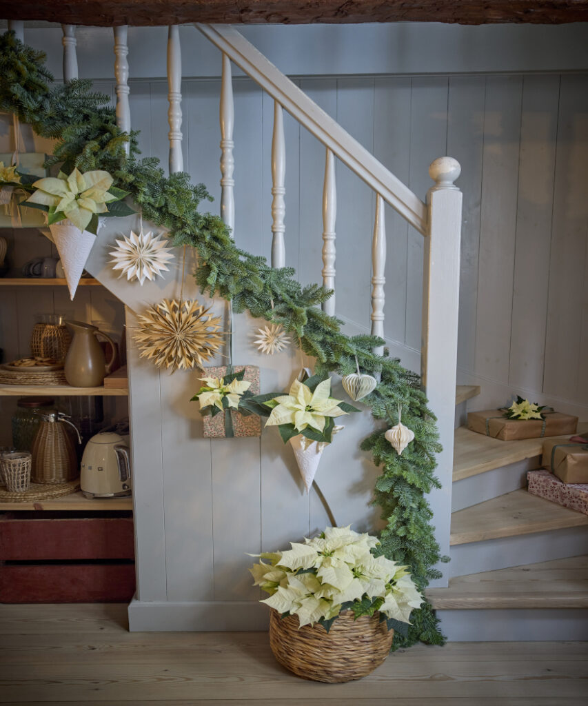 Δεξιά: Κρεμ-λευκά αλεξανδρινά, κομμένα αλλά και σε γλάστρες, πλαισιώνουν το κάγκελο της σκάλας και τα δώρα. Μια γιρλάντα από κλαδιά πεύκου, διακοσμητικά χάρτινα αστέρια και απλά φυσικά υλικά δημιουργούν μια σκανδιναβική χριστουγεννιάτικη ατμόσφαιρα.