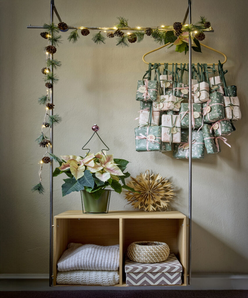 Αριστερά: Ένα χειροποίητο ημερολόγιο αντίστροφης μέτρησης για την ημέρα των Χριστουγέννων, σε απαλές αποχρώσεις του πράσινου και του ροζ, δίνει στυλ σε αυτή την κρεμάστρα ρούχων. Κρεμασμένα σε κρεμάστρα, τα όμορφα τυλιγμένα δωράκια ξεχωρίζουν ακόμη περισσότερο. Μια σειρά από φωτάκια και αλεξανδρινά σε απαλούς τόνους του κρεμ και του βερικοκί χαρίζουν στο δωμάτιο μια ζεστή, οικεία αίσθηση.