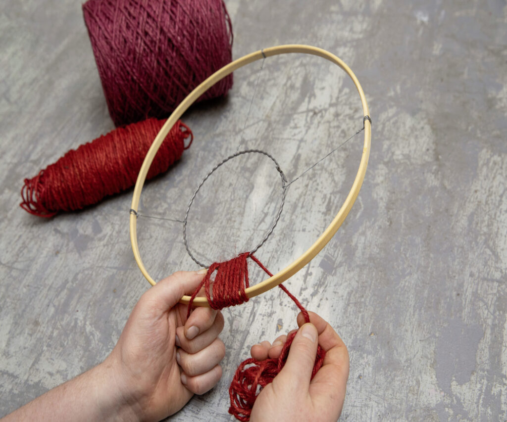Τυλίξτε σπάγκο σε διάφορα χρώματα γύρω από τα τελάρα (μικρό και μεγάλο), μέχρι να καλυφθούν εντελώς.