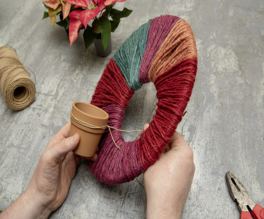Στερεώστε τη πήλινη γλάστρα επάνω στο τυλιγμένο τελάρο χρησιμοποιώντας το σύρμα χειροτεχνίας που είναι τυλιγμένο με χαρτί.