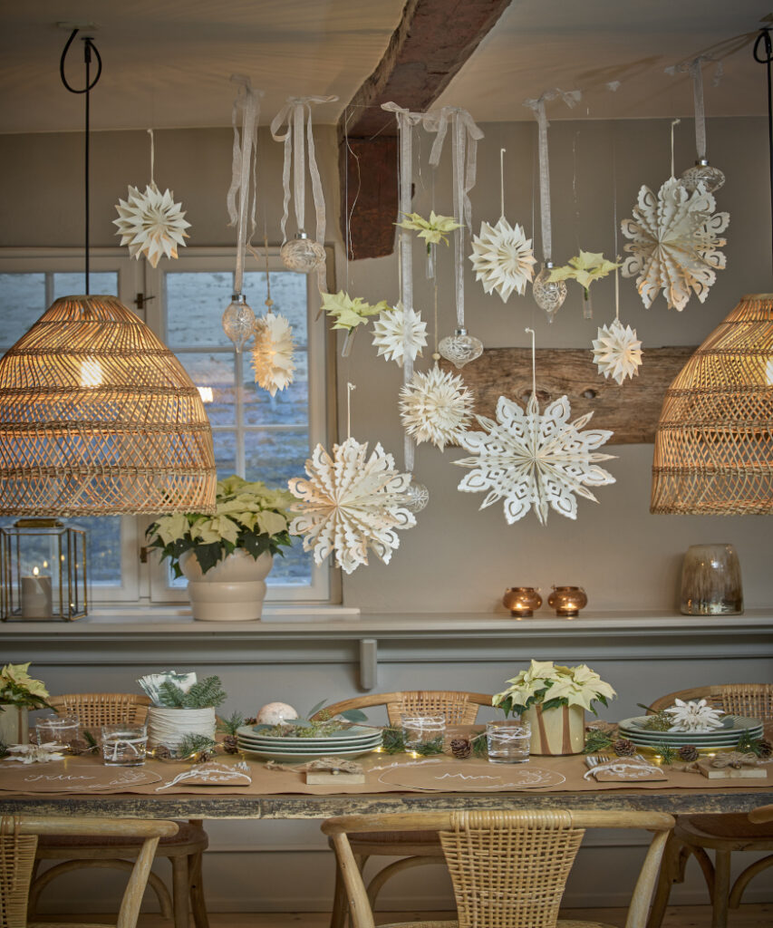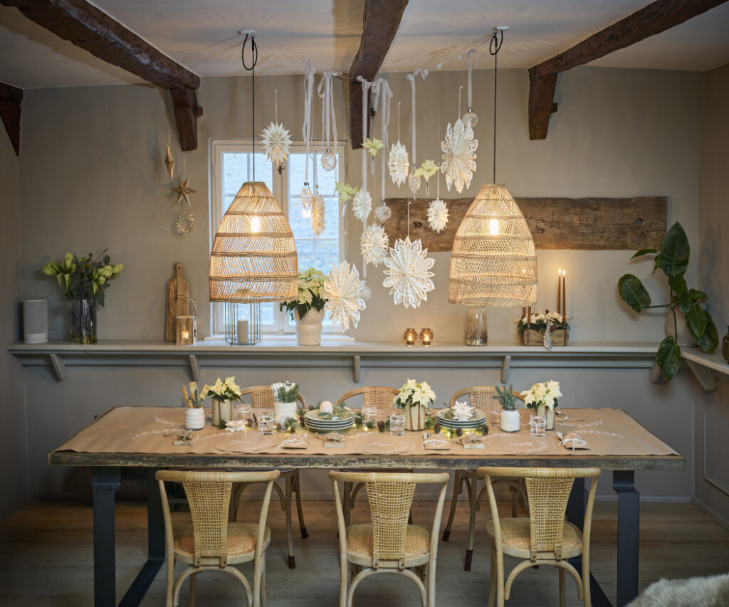 A meleg fényű rattan lámpákkal kombinálva ez a kompozíció ünnepi, skandináv téli romantikus hangulatot varázsol.