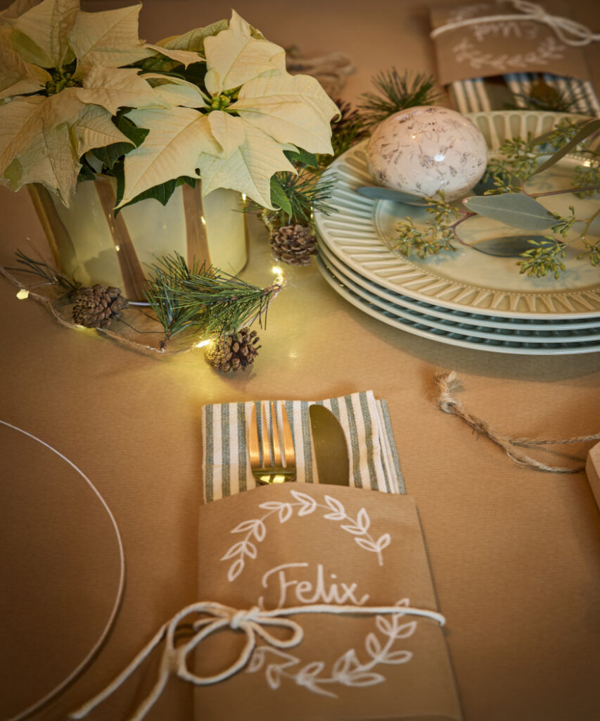 A csomagolópapírból készült terítő, evőeszköztartók és alátétek fenntartható megoldásokat kínálnak a dekor rajongóknak, miközben a krémszínű mikulásvirág, eukaliptusz, toboz és fényfüzér együttese egy igazán különleges hangulatot teremt.
