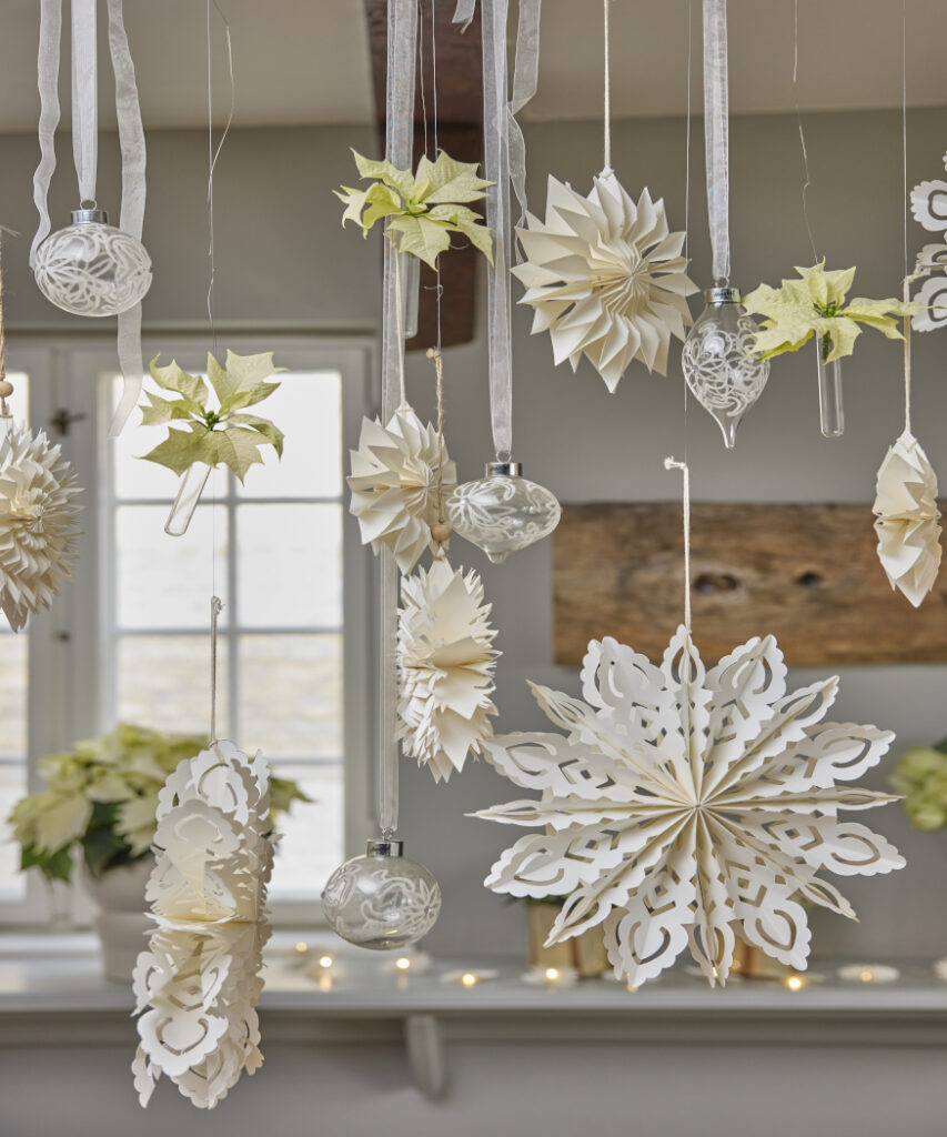 A papírcsillagok, üveggömb díszek és kémcsövekbe helyezett vágott mikulásvirágok mintha a levegőben lebegnének.