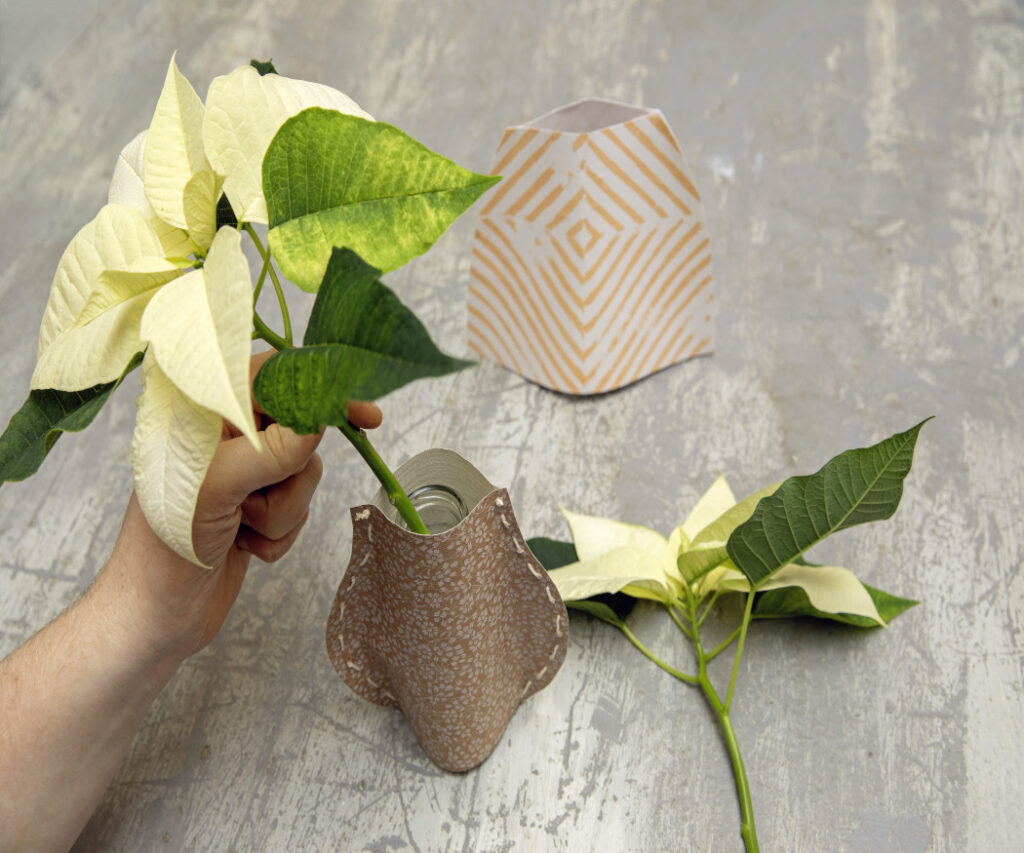 Amire szükség lesz: váza sablon, kis üvegpalackok, tapéta maradék, ceruza, olló, tű és cérna vagy ragasztópisztoly, mikulásvirág, egy pohár forró víz (kb. 60°C) és egy pohár hideg víz, valamint néhány kiegészítő virág.