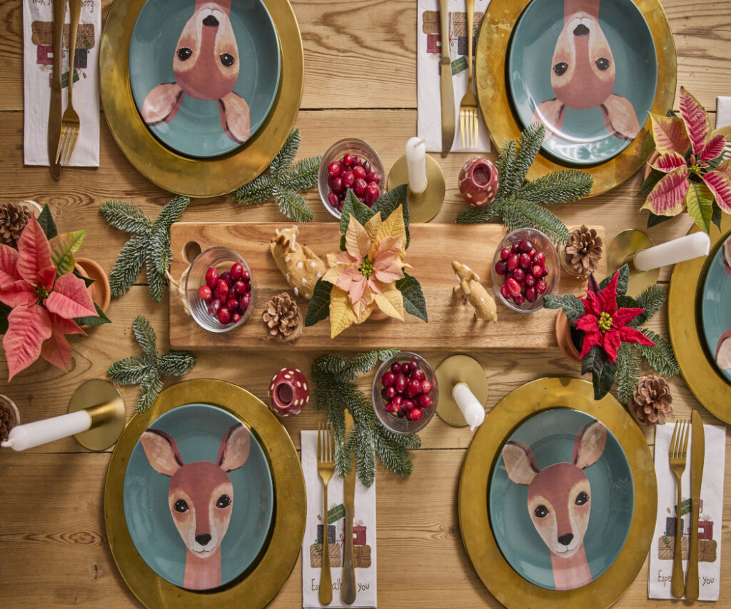 A kezeletlen fa asztal, a fenyőágak, tobozok és piros bogyók pedig fokozzák a rusztikus hatást. A mini mikulásvirágok – piros, barack, rózsaszín és krémszínű árnyalatokban – a fehér gyertyákkal és arany részletekkel együtt megkoronázzák az összhatást, kiegészítve az őzmotívumos tányérok és apró állatfigurák erdei, mesebeli hangulatával.