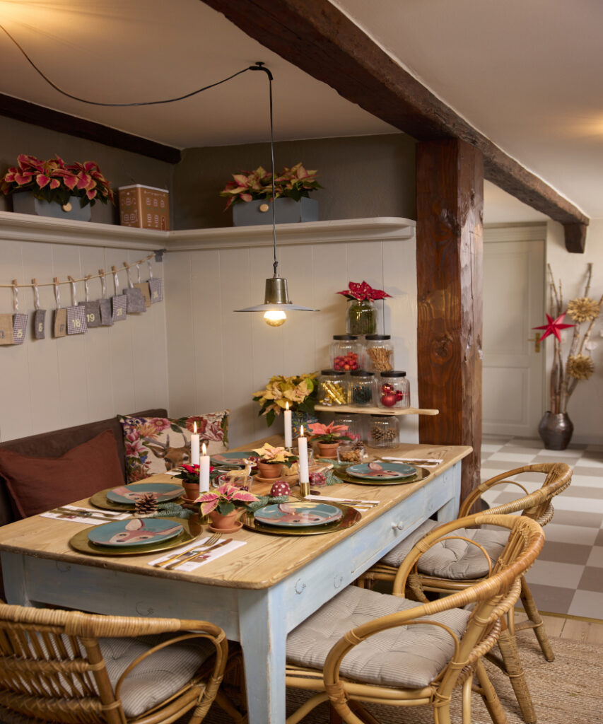 A természetes anyagok és meleg színek játékos hangulatot kölcsönöznek az ünnepi asztalnak.