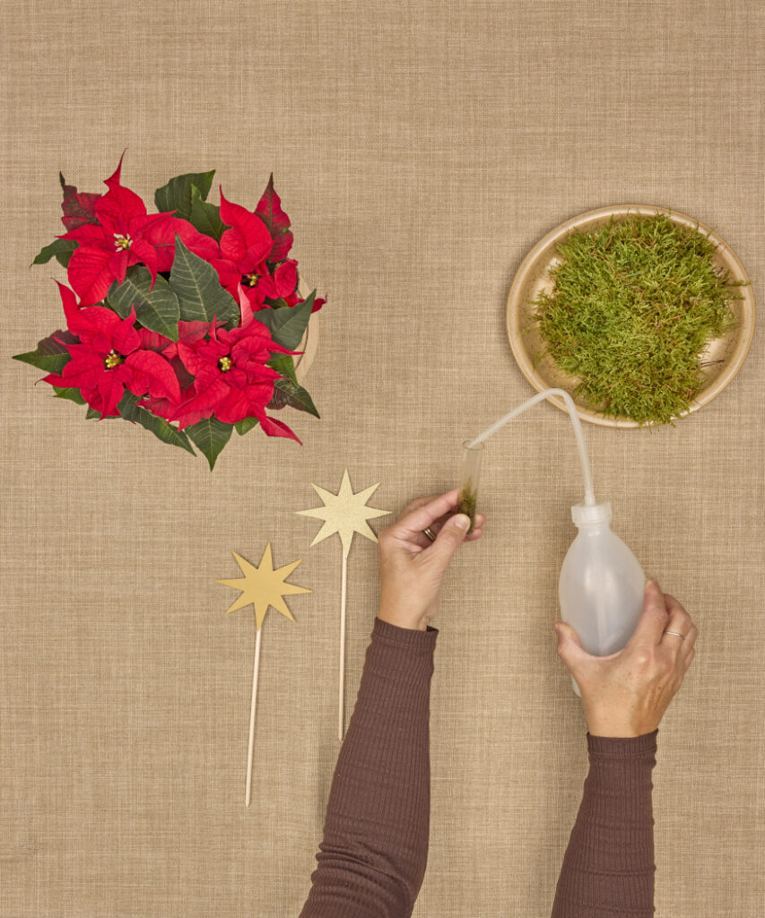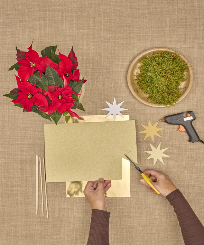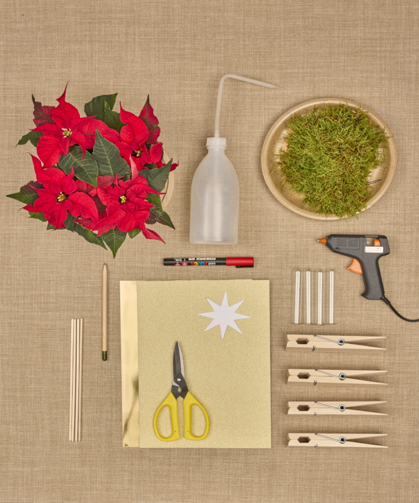 Amire szükség lesz: dús piros mikulásvirág, négy erős extra nagy fa ruhacsipesz, négy kémcső, arany karton, csillag sablon, fa pálcikák, olló, ragasztópisztoly, ragasztórúd, piros filc, ceruza, moha és vízzel tölthető flakon