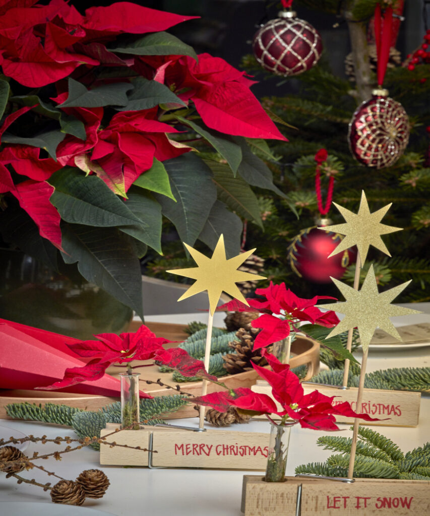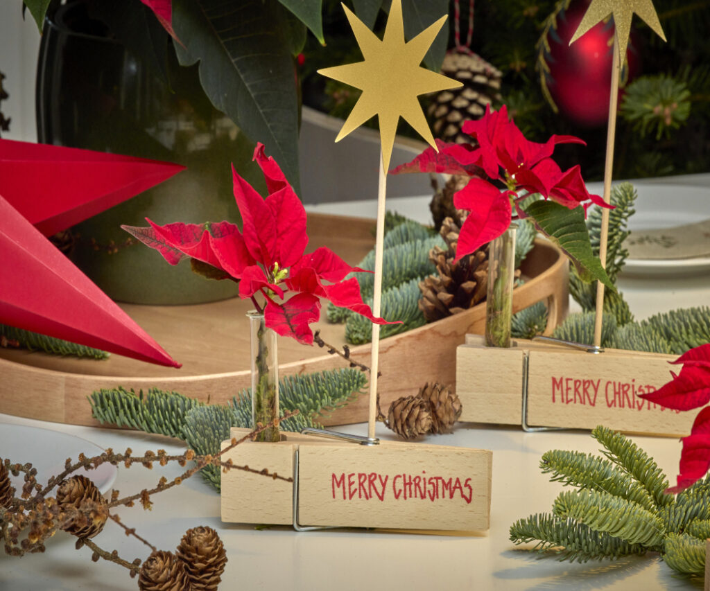 A hagyományos ültetőkártyák helyett kreatív ötlet arany kartonból készült csillagokat, fa ruhacsipeszeket és kémcsövekbe helyezett vágott mikulásvirágokat használni, tökéletes választás a klasszikus karácsonyi dekorációk kedvelőinek.
