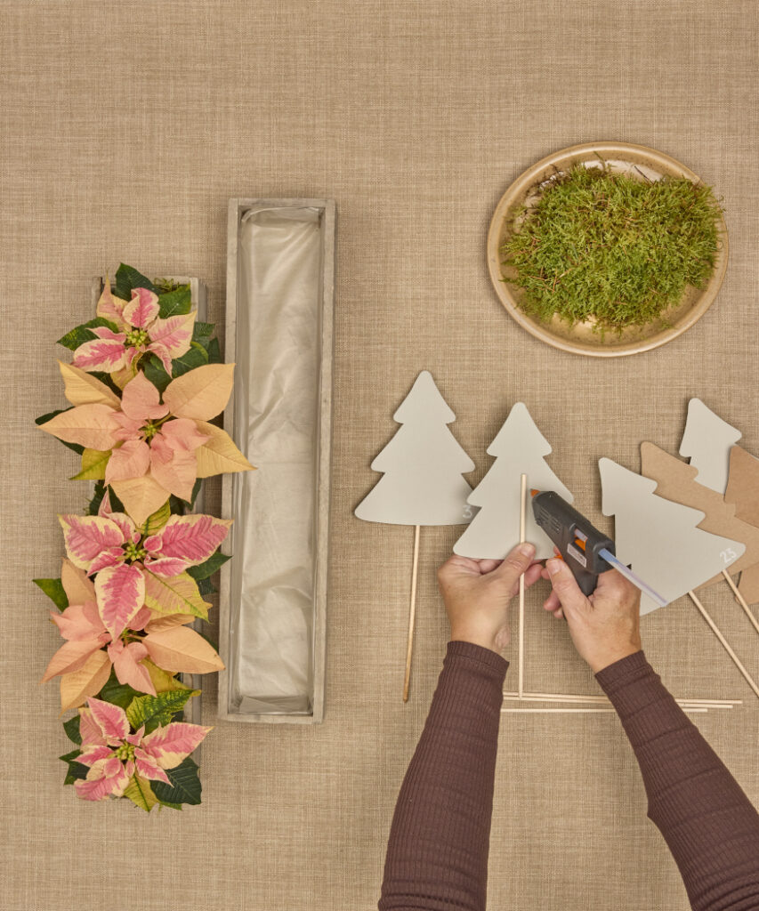 Due lunghe cassette di legno, riempite di muschio e mini Stelle di Natale nei toni del rosa e dell’albicocca, costituiscono la base di questa decorazione speciale.