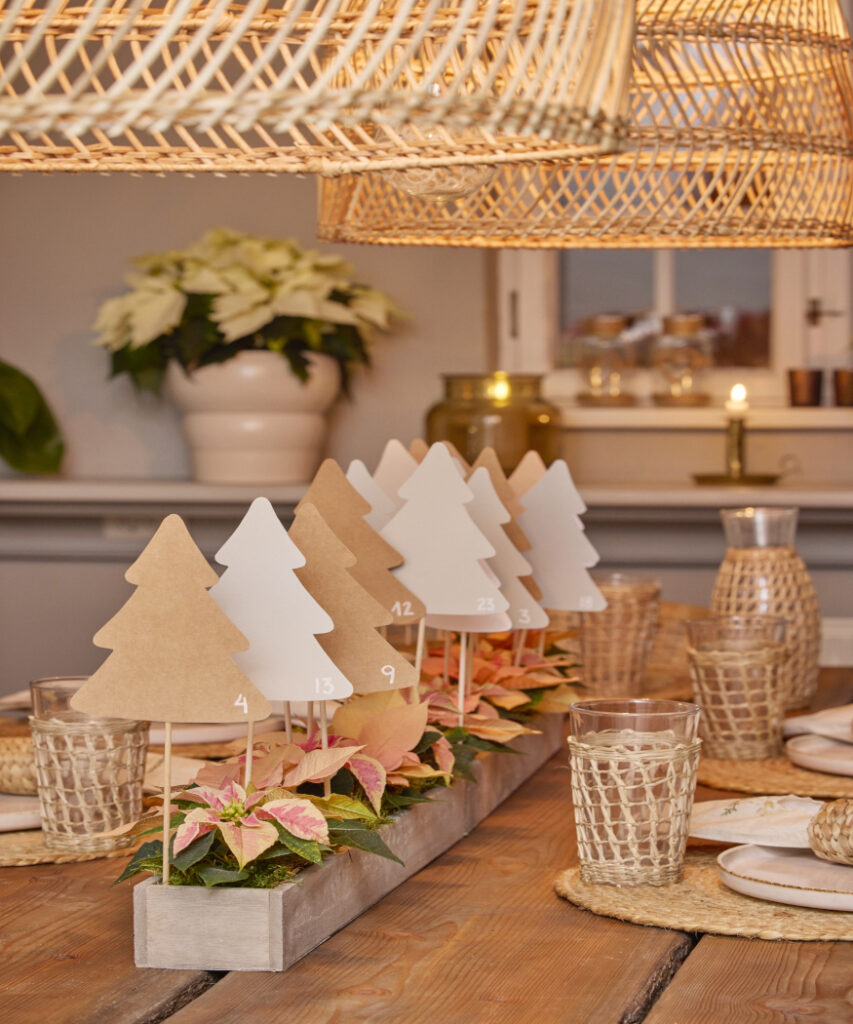 Ventiquattro alberelli di cartoncino numerati, disposti uno accanto all’altro, creano un’atmosfera delicata e suggestiva.