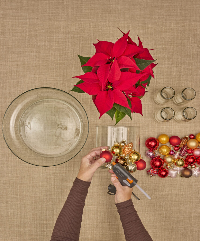 Step 1: Usa la pistola a caldo per incollare palline e altre decorazioni sul vaso di vetro cilindrico, partendo dalla base e procedendo verso l’alto. Lascia raffreddare gli elementi tra un’applicazione e l’altra. In questo modo otterrai un coprivaso festivo che esalterà la Stella di Natale. Ripeti la stessa operazione con la ciotola di vetro.
