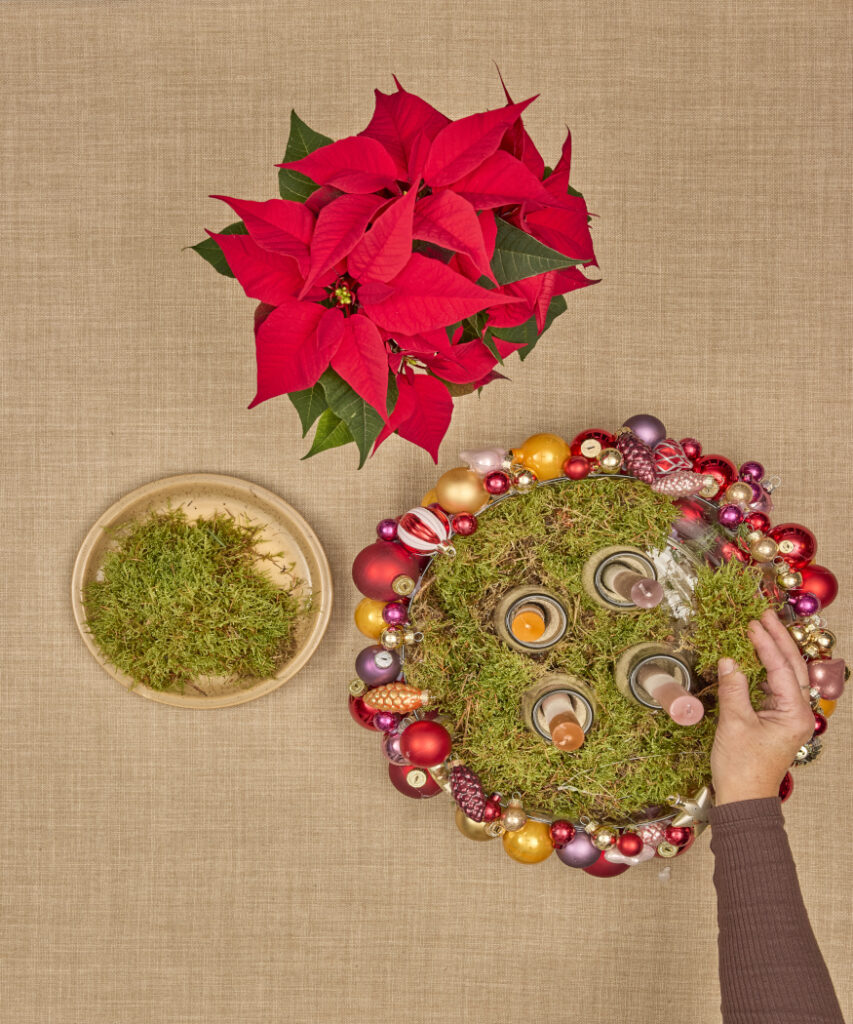 In questa ricca composizione d’Avvento a sinistra, la ghirlanda e la Stella di Natale in vaso formano un insieme armonioso.