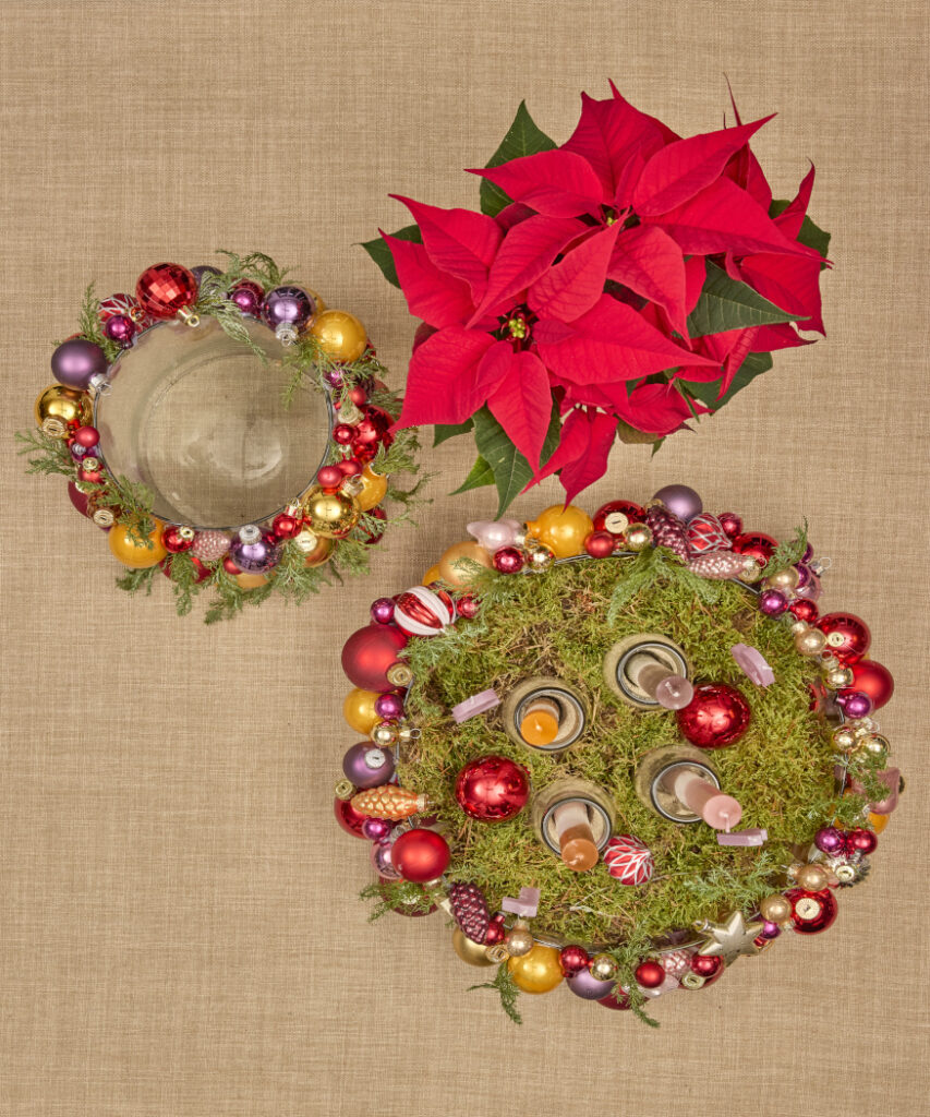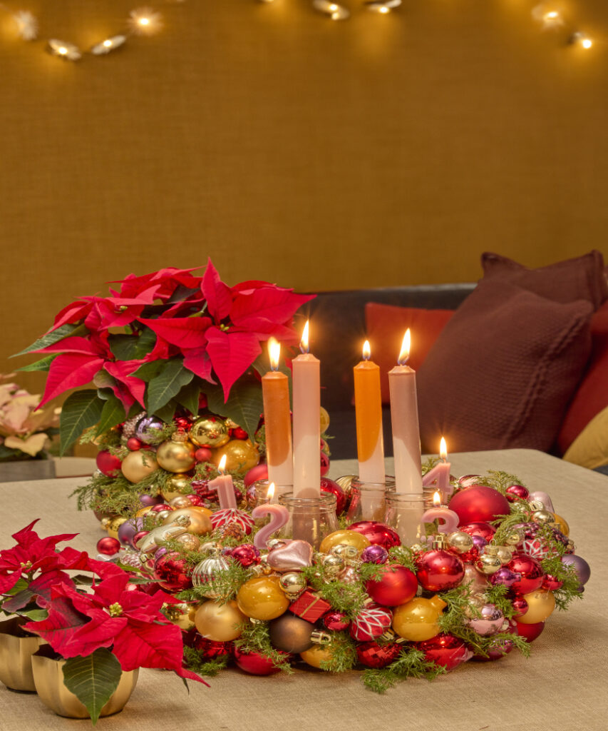 È un’ottima soluzione salvaspazio che unisce il centrotavola al tradizionale simbolo dell’Avvento in casa. Entrambi gli elementi sono impreziositi da palline lucide e colorate, muschio e ginepro.