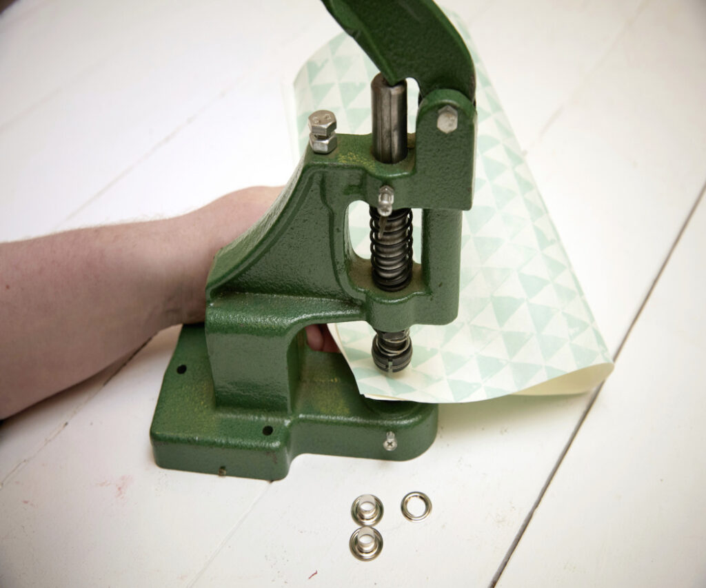 - Inserisci gli occhielli metallici nei fori e fissali con l’apposita pinza: questo