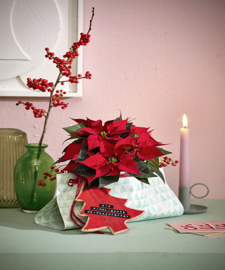Ad esempio, una Stella di Natale dal rosso intenso diventa ancora più speciale se avvolta in una borsa fai-da-te realizzata con ritagli di carta regalo. Un’etichetta in legno con un messaggio scritto a mano e qualche rametto decorativo di rosa canina completano la sorpresa, creando un regalo intimo e perfetto per gli amanti dell’home made.