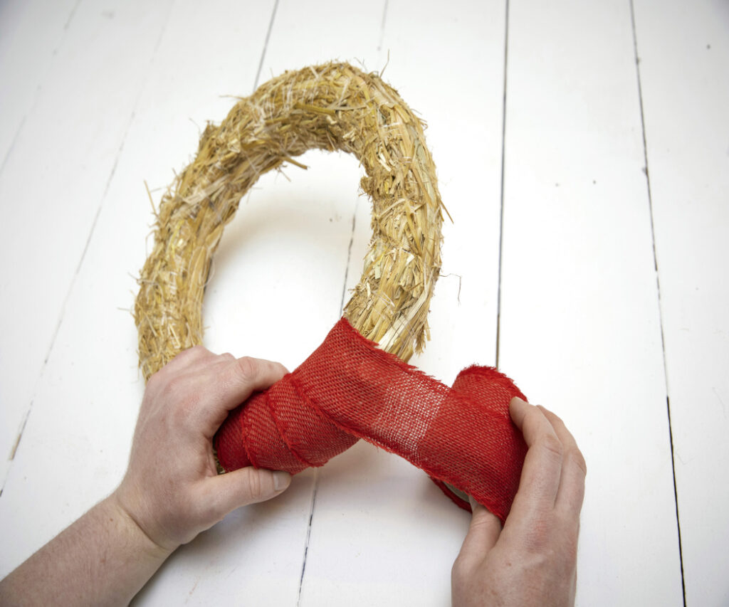 - Avvolgi la ghirlanda di paglia con il nastro.