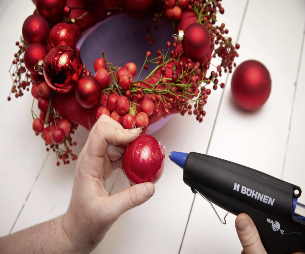 - Posiziona la corona sul bordo del vaso e incolla le palline decorative con la colla a caldo.