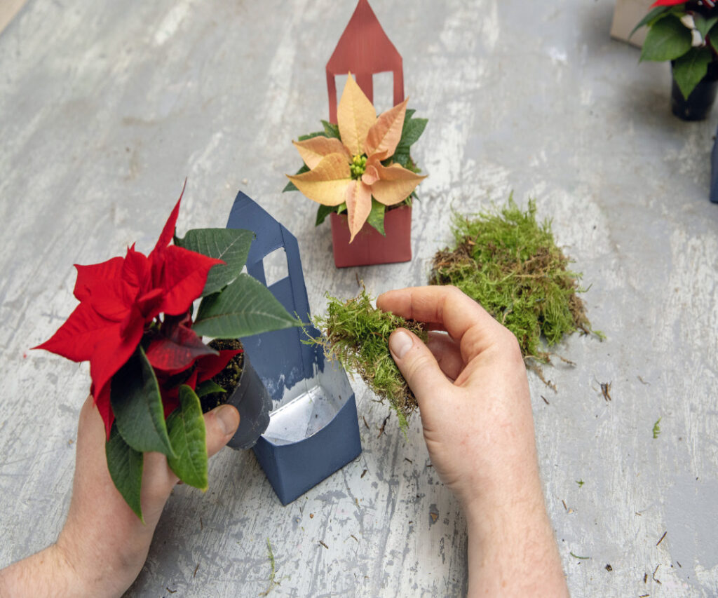 4. Sistema le piante: per le casette aperte, metti del muschio sul fondo: servirà a mantenere ferme le mini Stelle di Natale e darà un tocco più naturale. Poi inserisci le piante (lasciandole nel loro vasetto) nelle casette-contenitore e copri i bordi dei vasi con altro muschio.