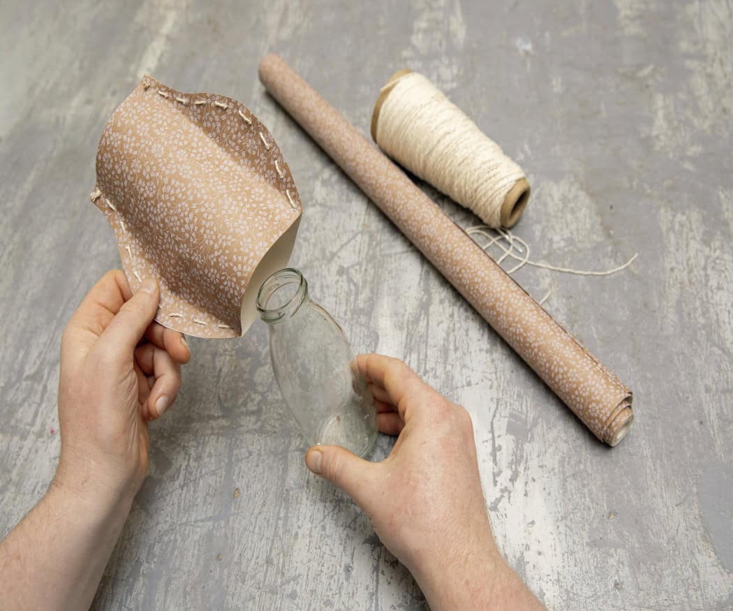 Krok 4: Do hotového obalu opatrne vložte fľašku a naplňte ju vodou.