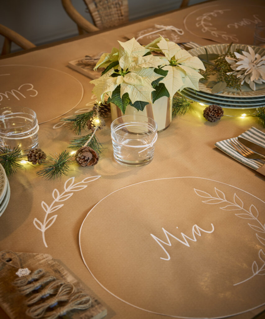 Obrus, obrúsky na príbory a podložky na stôl z baliaceho papiera sa postarajú o udržateľné prvky, zatiaľ čo krémové vianočné ruže, vetvičky eukalyptu, šišky a svetielka navodia čarovnú atmosféru.