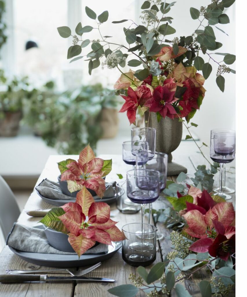V tejto elegantnej dekorácii na stôl v severskom štýle boli krémové vianočné ruže skombinované s vetvičkami cezmíny verticillata (Ilex verticillata), plodmi eukalyptu (Eucalyptus robusta), antúriou (Anthurium andraeanum) a exotickými kvetinami (Protea neriifolia), aby vytvorili takúto nádhernú výzdobu.