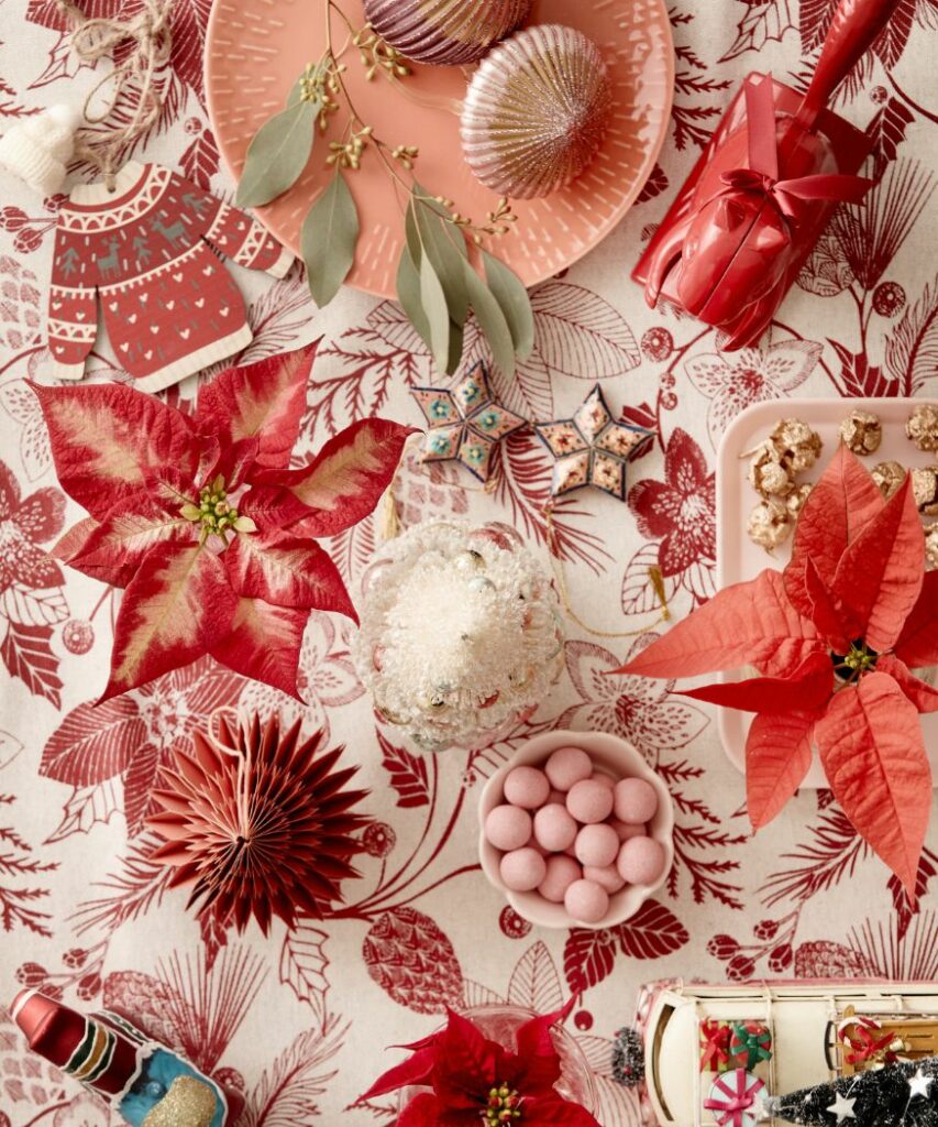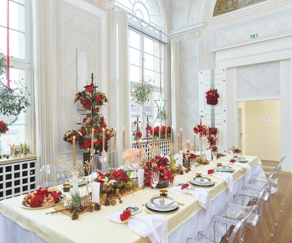Rezané ružové vianočné ruže, zlaté vázy a poháre, trblietavé vianočné ozdoby, sviečky a vianočné svetielka – to všetko dodáva tomuto slávnostne prestretému stolu vianočný nádych, romantickú atmosféru, aj dotyk nostalgie. Stonky cezmíny verticillata a eukalyptu skvostne dopĺňajú vianočné ruže. Ďalšie rezané vianočné ruže sú umiestnené v skúmavkách s vodou a naaranžované na tanieroch spolu so šiškami.